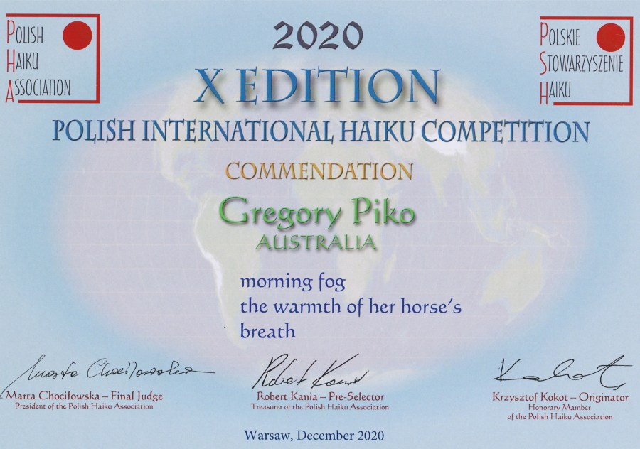 Each year, the Polish Haiku Association conducts an international haiku competition. The 10th Polish International Haiku Competition was conducted in 2020 and attracted entries from 52 countries. You can read the awarded poems and see the judge’s comments here.